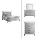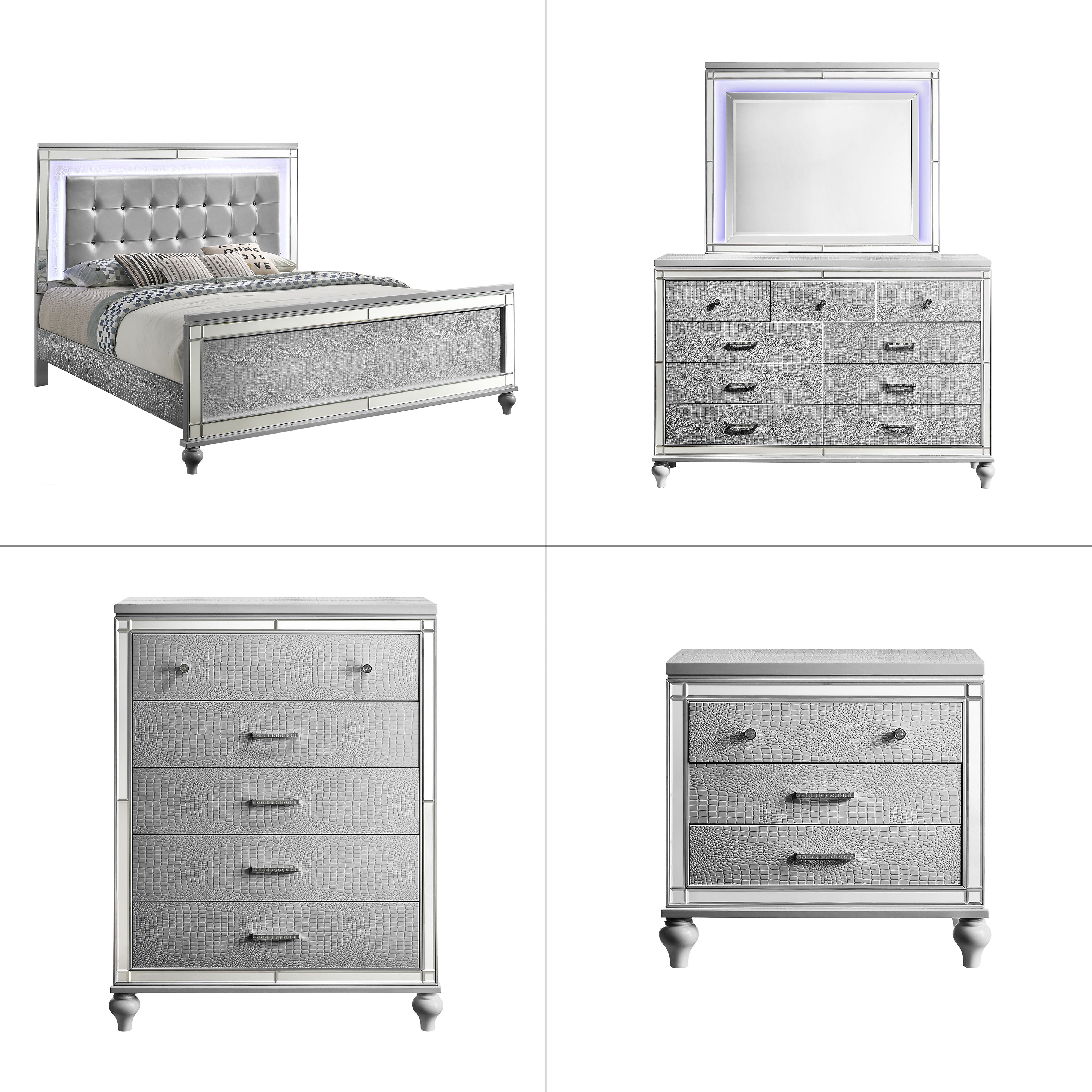 The Valentino Bedroom Set is an opulent collection designed to transform your bedroom into a glamorous retreat. This set includes a bed with touch lighting, a dresser, a lighted mirror, and two nightstands, all meticulously crafted from a durable combination of manufactured and solid woods with decorative embossed inlays for long-lasting quality and distinction. The bed features a crystal button-tufted padded headboard, a gleaming finish, mirrored trims, and alligator embossed inlays, evoking an unparalleled Hollywood glam appeal. Soft LED lighting in the headboard and dresser mirror provides ambient illumination, creating an intimate and luxurious atmosphere. The nine-drawer dresser offers ample storage for clothing, while the three-drawer nightstands conveniently hold your bedside essentials. This exquisite bedroom set combines extravagant style with exceptional craftsmanship, bringing a touch of star quality to your contemporary bedroom suite.