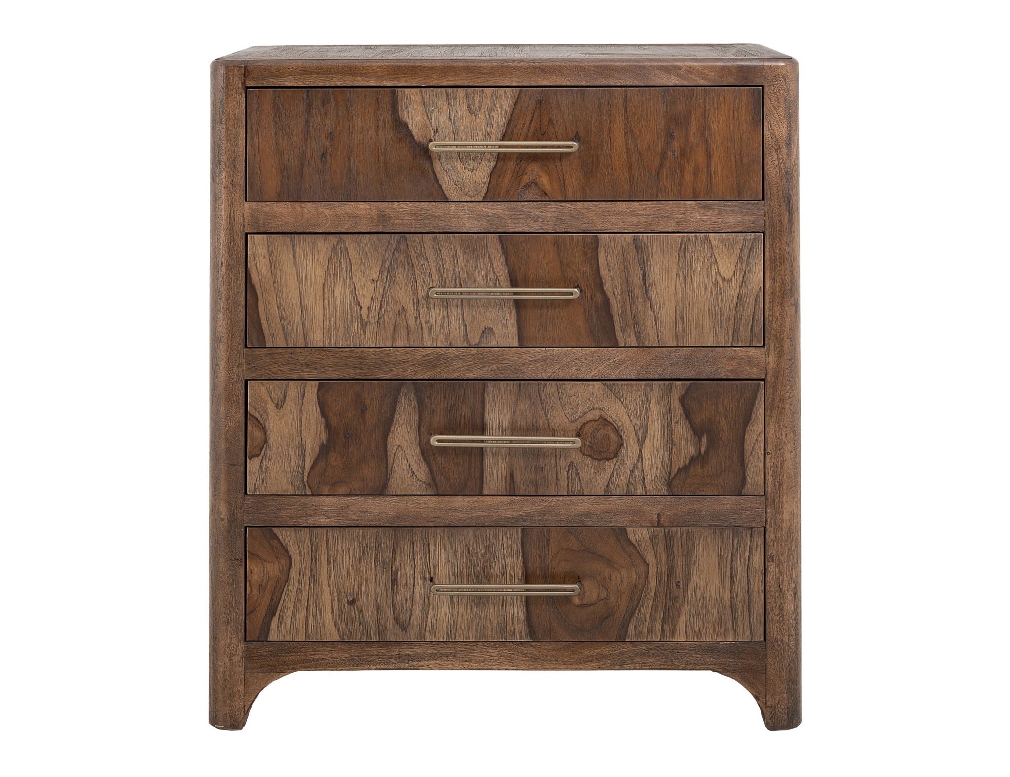 4 Drawer, Chest. Transform your space with this modern bedroom set. Crafted from engineered teak and sustainable mango wood, this collection combines lasting durability with natural beauty. The rich brown multi-step lacquer finish adds warmth and depth to the furniture. The Praga chest has four spacious drawers for ample storage. The aged golden handles add a touch of sophistication, while its short, sturdy legs provide balance and stability, making it a versatile addition to any space.