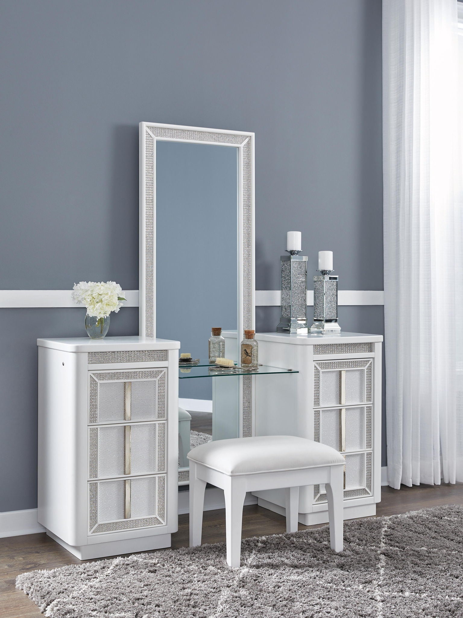 - Drawers with rhinestone frames; textured laminate drawer fronts