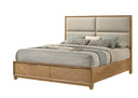 This contemporary bedroom group brings a sense of warmth and modern elegance to any space with its clean lines and natural wood tones. The upholstered panel headboard adds a soft, inviting touch, while the platform bed offers integrated footboard storage for added functionality. Sleek metal drawer pulls complement the streamlined silhouettes of the matching nightstand, dresser, and chest, enhancing the set’s minimalist appeal. Finished in a light wood grain, the ensemble exudes a relaxed sophistication, perfect for creating a bright and calming retreat.