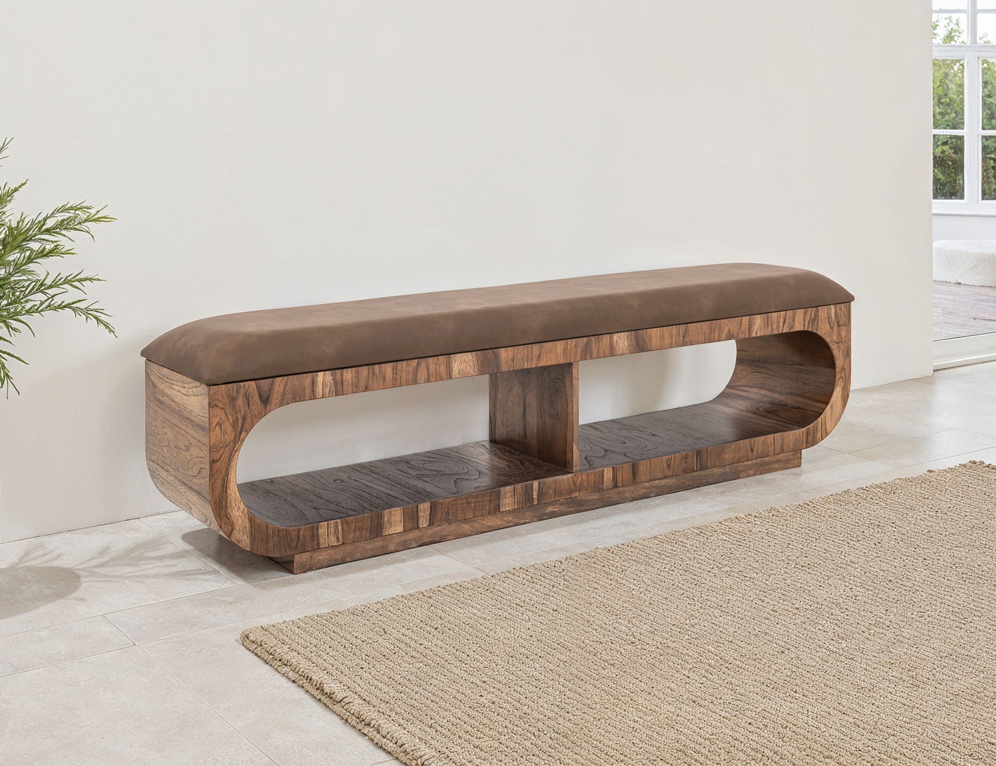 Upholstered Seat Bench with Two Open Shelves. The Balam bench is a beautifully crafted piece made from sustainable mango and engineered teak wood. Its elegant design blends organic warmth with modern sophistication, making it a perfect addition to any space. The bench features a comfortable cushioned seat with gently rounded corners and an open storage compartment for books, blankets, or decorative items. Ideal for an entryway, bedroom or reading nook, the Balam bench adds effortless charm to any setting.