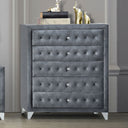 5 Drw • Drawer: Velvet Padded Fronts, GLIDE Side Metal (2/3 Ext.), DOVETAIL English Front & Back, NOT FELT-LINED, Safety Stop, Manual Close, Hardware: Single Pull Crystal-Like Knob (Plastic, Removable) •• CONSTRUCTION: Fully Padded Case • Wooden Inner Frame: Wood, Chipboard, MDF, PB • Metal Leg: Chrome •••