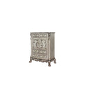 The Dresden Chest is crafted with the finest solid woods with veneers in finish. Dresden Collection is enhanced by remarkable marquetry and generously carved wood elements. The case goods feature solid hardwood with five drawers and two door with shelf for storage with coordinating carvings. The drawers feature dovetail construction and are decorated with antique brass hardware. This beautiful Dresden Bedroom Collection will add magnificence to your bedroom!