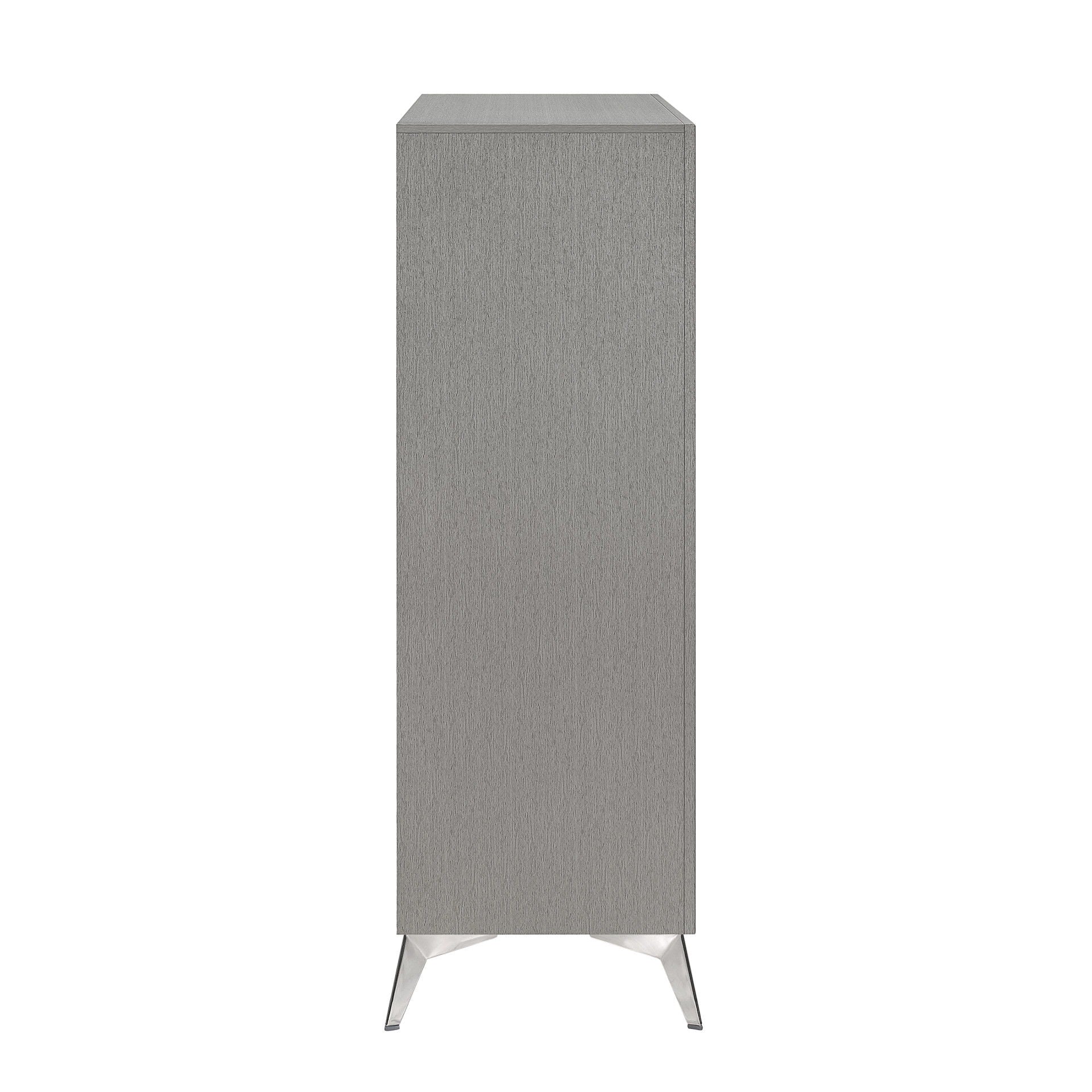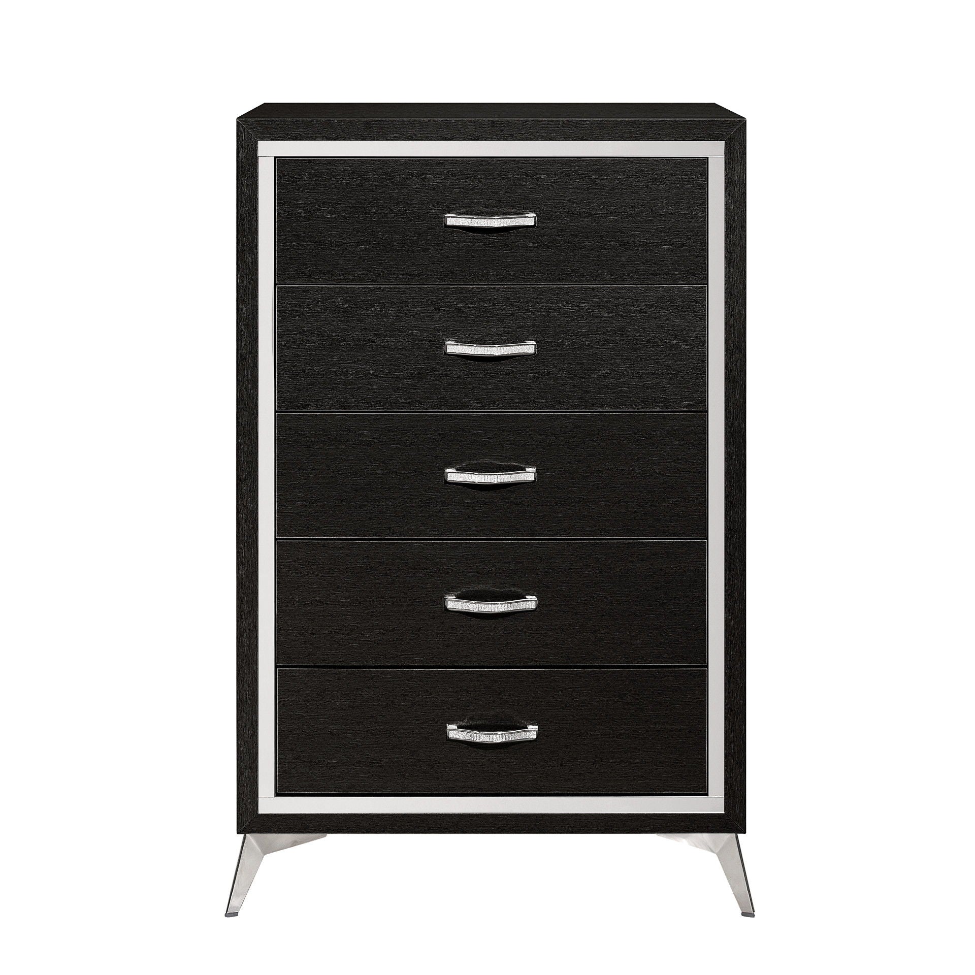 The Huxley 5-Drawer Chest combines contemporary glam with durable construction for a stylish addition to your bedroom. This vertical dresser is crafted from manufactured woods and eco-friendly decorative laminate, ensuring it will stand the test of time. The design features clean lines with metallic accents and flared silver legs, adding a modern touch. Its rich finish provides a sleek, sophisticated look that is both timeless and modern, highlighting the metallic accents and smooth surfaces for a chic and polished aesthetic. The quality drawer construction includes English dovetail joinery and smooth-rolling center glides for long-lasting operation. Functional and fashionable, this chest offers ample storage for clothing, with chic, crystal-studded drawer pulls for easy access.