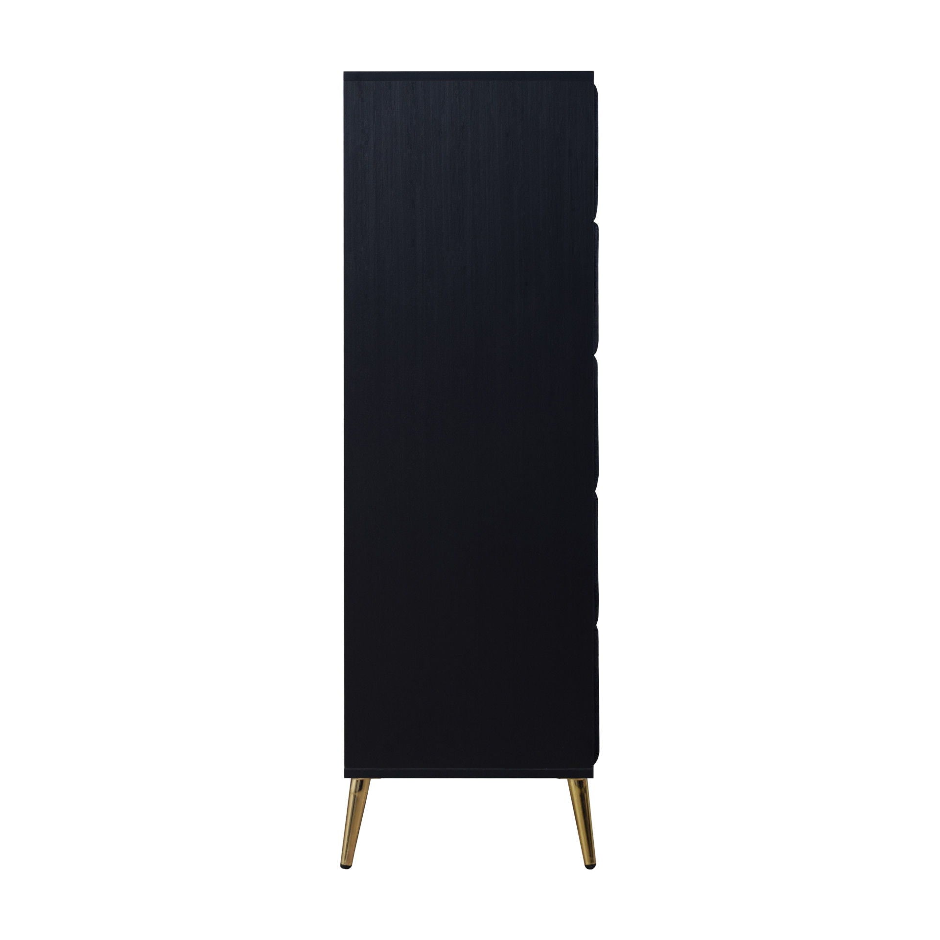The Kailani 5 Drawer Chest is a perfect blend of modern design, durability, and eco-friendly construction, making it an ideal addition to any bedroom. Expertly crafted from a mix of solid rubberwood, engineered wood, and eco-friendly decorative laminate, this chest offers lasting style and sustainability. The laminate finish not only enhances the chest's appearance but also provides superior resistance to scratches, moisture, and stains, ensuring its beauty with minimal maintenance. The chest features a modern minimalist design with clean lines, a sleek silhouette, and a chic ribbed texture, complemented by slim metallic handles and tapered legs that add both elegance and durability. The drawers, wrapped in luxurious 100% Polyester Velvet and accented by chrome pulls, bring a touch of sophisticated glamour to your space. Each drawer is designed for seamless functionality with fully finished interiors, full-extension slides, and dovetail joinery, providing smooth, snag-free storage and lasting strength. The Kailani 5 Drawer Chest combines style, function, and sustainability, making it a standout piece in any modern bedroom.