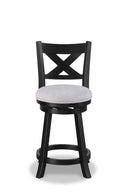 Introducing a touch of rustic charm mixed with urban sophistication, these counter stools are a perfect blend of style and functionality. The rich, deep wood finish accentuates the intricate cross-back design, adding a visually captivating element. Paired with soft dove gray upholstery, these stools ensure both comfort and elegance.