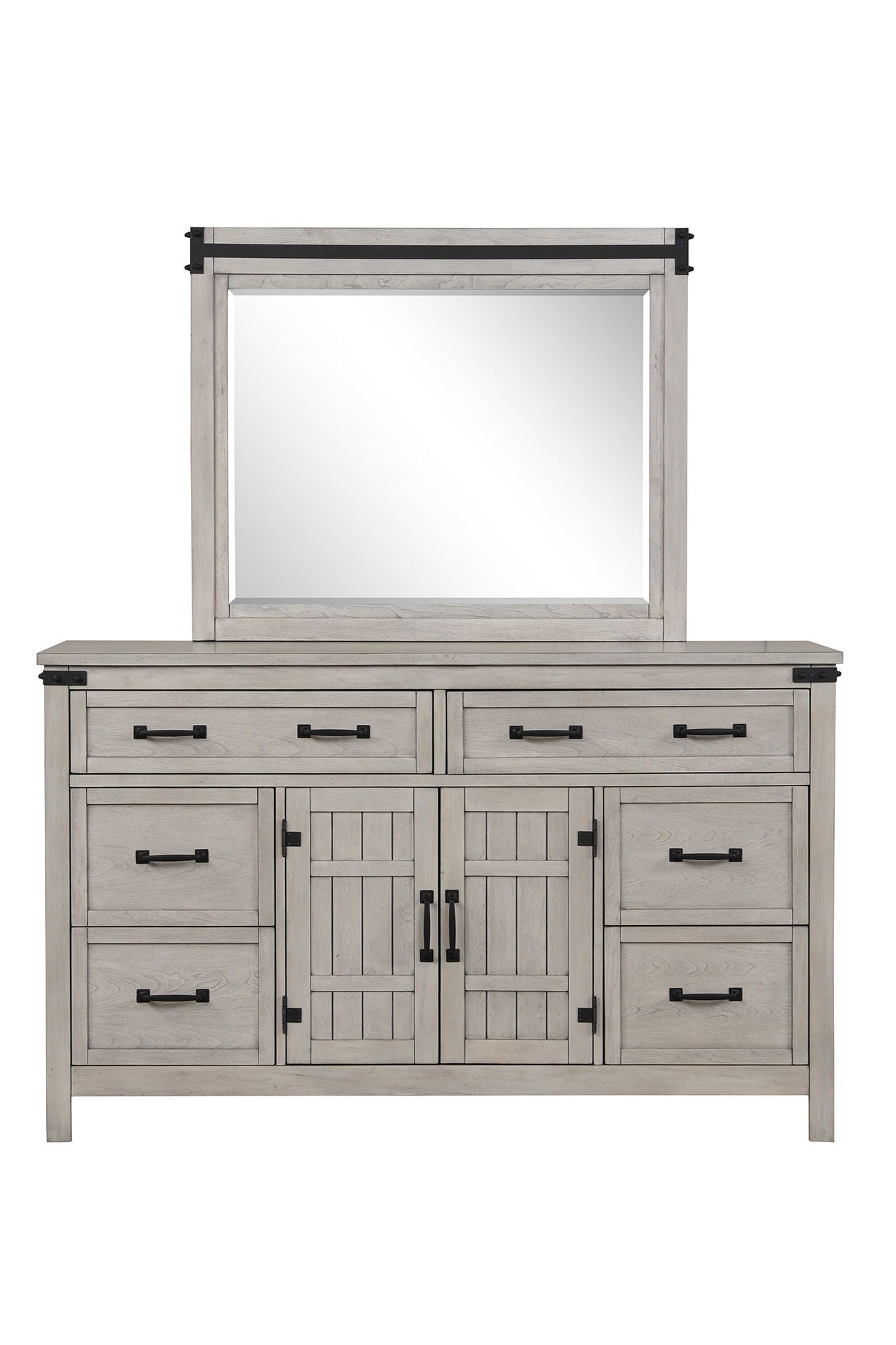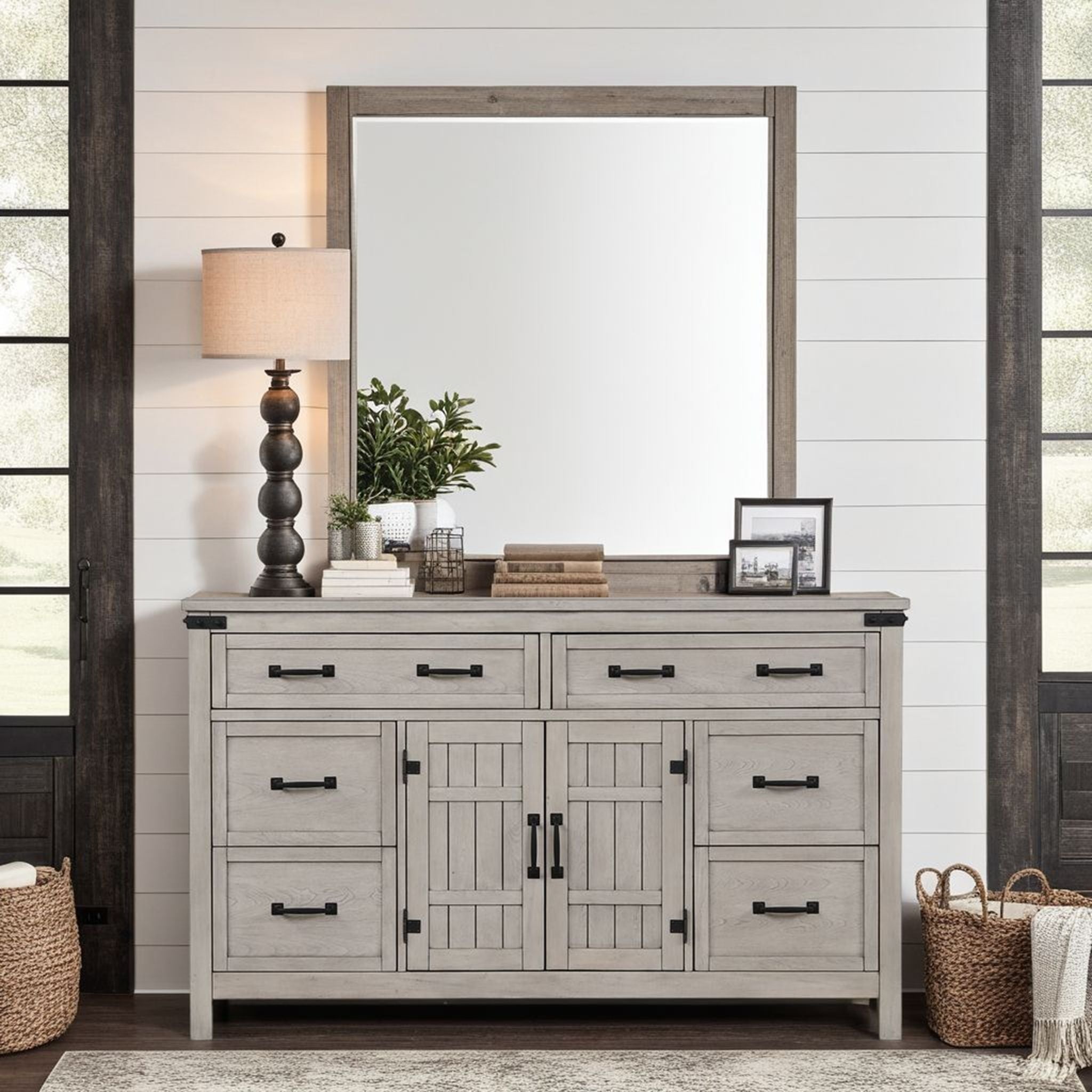 The Alexandria Dresser from Bridgevine Home delivers a Modern Farmhouse-Industrial-Rustic style trifecta. Skillfully crafted from Poplar Solids and Birch Veneers, this Dresser is finished in Mountain Mist with Forged Iron rivets and hardware. Featuring six drawers and two doors, this dresser will provide ample storage for clothing and jewelry and make a stylish addition to your main or spare bedroom. Fully Assembled upon arrival, this piece from Bridgevine Home is ready to unbox and enjoy.