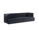 Sophistication meets modern with the Ansario living room collection. The rich blue velvet adds character to any room. Showcasing a square back, high arms, and nail-head trim, feature button tufted accents. The acrylic legs give off a modern vibe to the pieces. The full foam seats ensure that your next TV binge will be done in complete comfort.