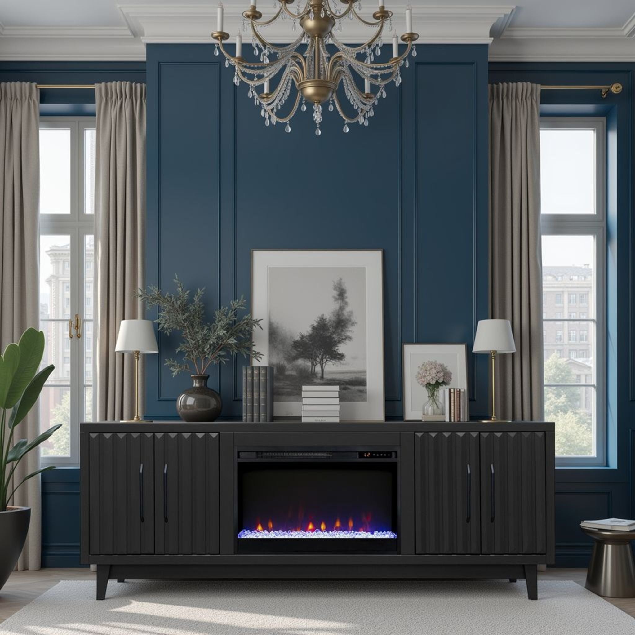 Sophisticated, modern style doesn't get better than the Radiance Fireplace TV Stand. Artfully crafted from Poplar Solids and Okume Veneers, this showstopping Entertainment Center with Fireplace is available in two rich finishes and includes Matte Black Hardware. Two stunning fluted doors conceal interior shelving for media and gaming consoles and more. Cable management openings on the back panel will keep all cords and wires organized an out of sight.