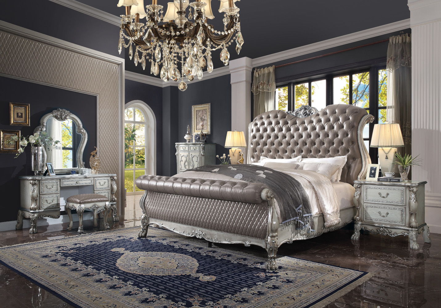 Create an elegant, classy design in your bedroom with the Dresden patina and mirror. This mirror features a beautiful scrolled frame with beveled edges. Add this mirror to any other piece from this collection to create the perfect bedroom.