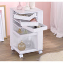 Rectangular Storage Cart (Free Standing) • Storage: 3 Swiveling-Drawers, 5 Open Compartments (2 Front, 1 Back & 2 Side) • Includes: Wooden Frame, Caster Wheels () •• CONSTRUCTION •• Wooden Case-Frame: Veneer (PVC/PU), MDF • Caster Wheel Included (2 w/Lock) ••• Drawer: GLIDE NOT Included (), DOVETAIL NOT Included, Full Finished Inside, Manual Close, Hardware NOT Included • Q&A] Drawer Size: 9" x 7" x 2"