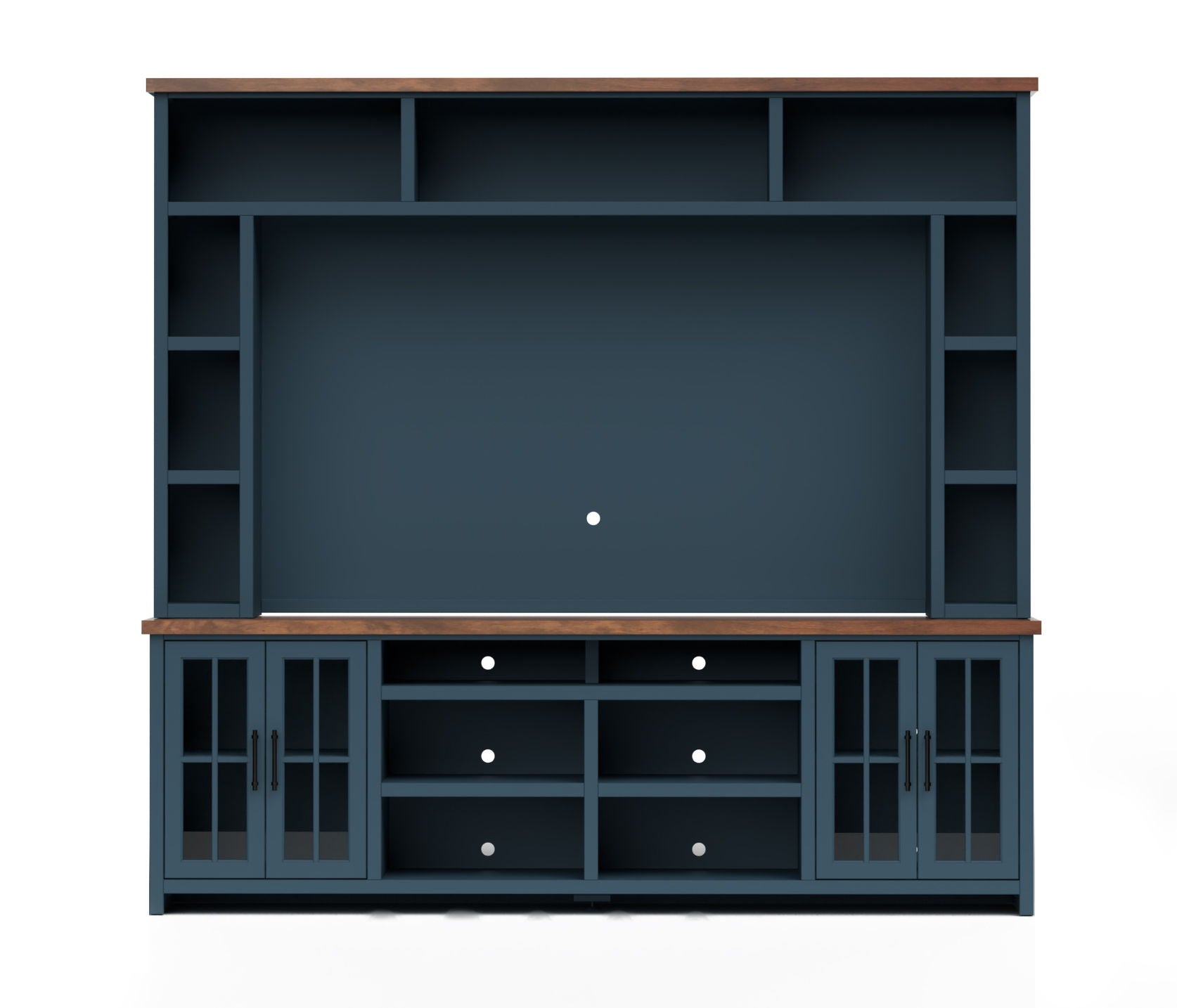 The Nantucket 97” Entertainment Center delivers a flawless combination of modern farmhouse style and country simplicity. Beautifully crafted from Poplar Solids, Okoume Veneers and Knotty Alder, this Entertainment Wall features a two-tone Blue Denim and Whiskey finish and oil-rubbed Bronze hardware. Ideal for TVs up to 80 inches, this Entertainment Center includes four glass windowpane doors, thirteen shelves and cable management on the back panel for media and gaming console storage. Fully Assembled upon arrival, these pieces from Bridgevine Home are ready to unbox and enjoy. Fully Assembled upon arrival, these pieces from Bridgevine Home are ready to unbox and enjoy.