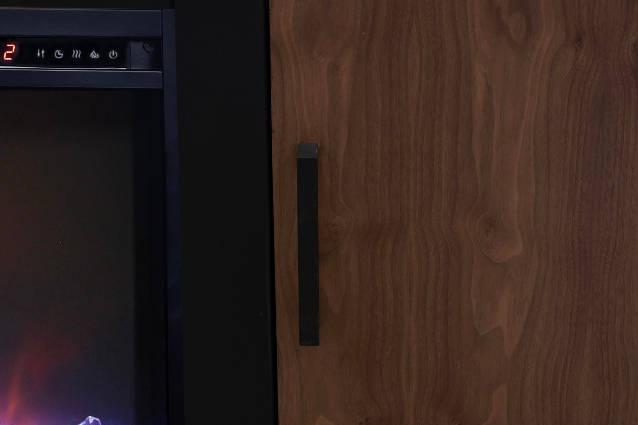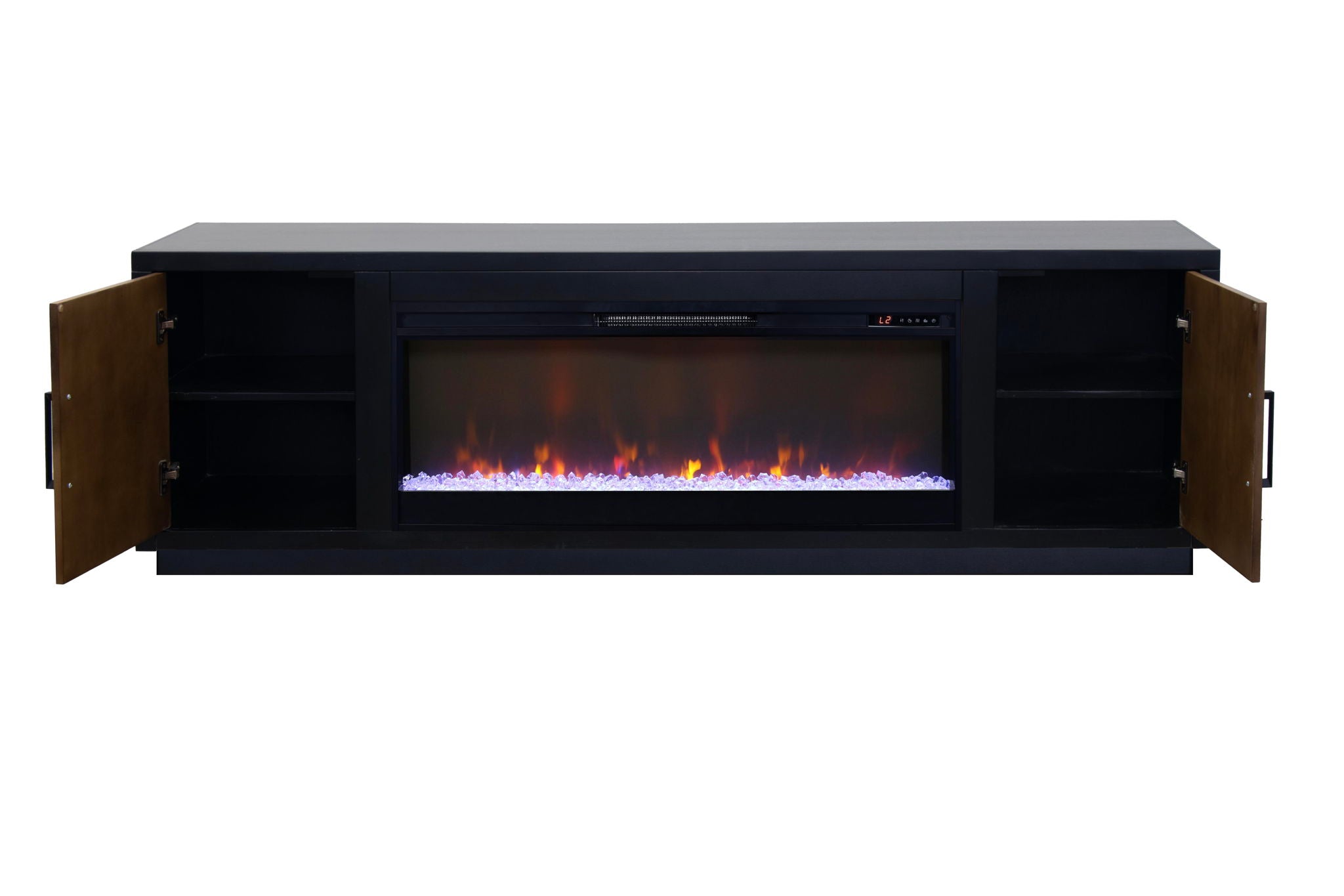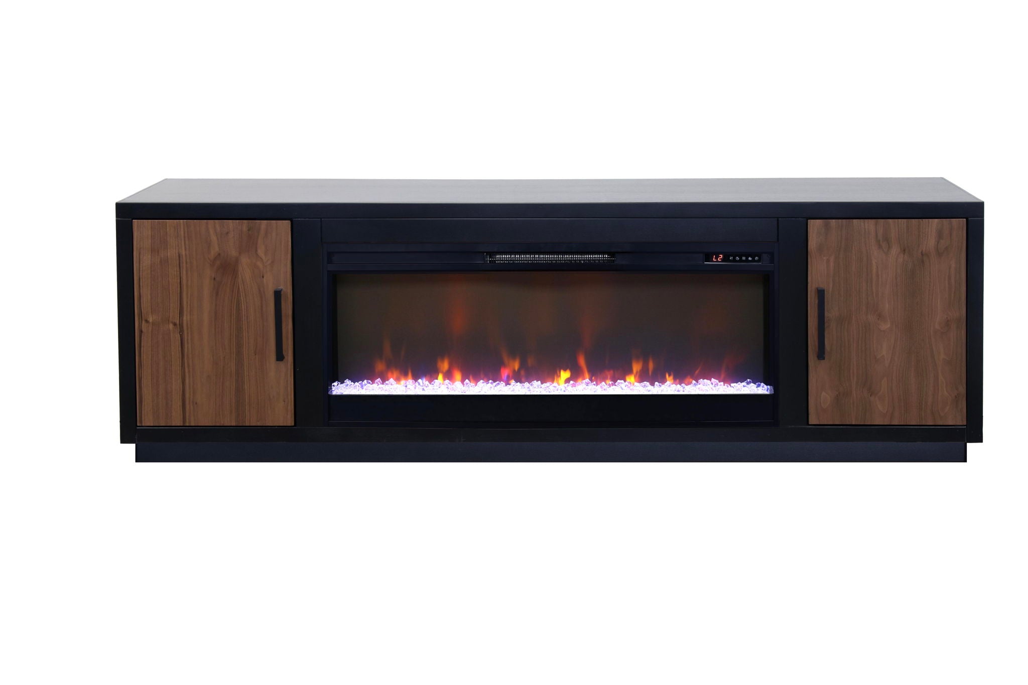 The Aria Fireplace TV Stand boasts chic, modern, contemporary style. Exquisitely crafted from Poplar Solids and Okoume Veneers and Walnut Veneers, this Entertainment Center with Fireplace features clean, structural lines, a Two-Tone Black and Walnut finish, Black hardware and plinth bas. Cable management openings on the back panel will keep all cords and wires concealed.