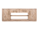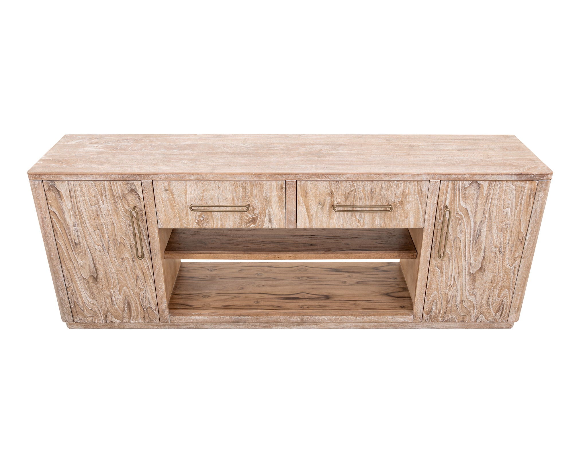 2 Drawer & 2 Door TV Stand, 80" for Fireplace. Our Balam collection is handcrafted from mango and teak wood. This simple yet stunning collection will bring an organic, modern touch to your space. This 80-inch TV stand becomes the heart of your living space, featuring two drawers and two doors for ample storage and a design that highlights the wood’s unique grain. Now enhanced with a fireplace insert, it offers not only style but also a cozy ambiance. Pair it with two matching piers to form a stunning wall unit that frames your space with harmony and sophistication. Every detail speaks of artistry, transforming your home into a sanctuary where modern design meets timeless warmth.