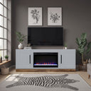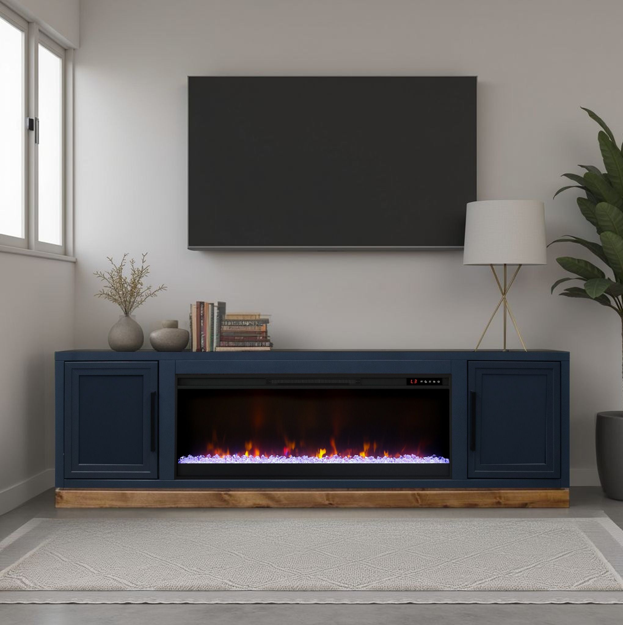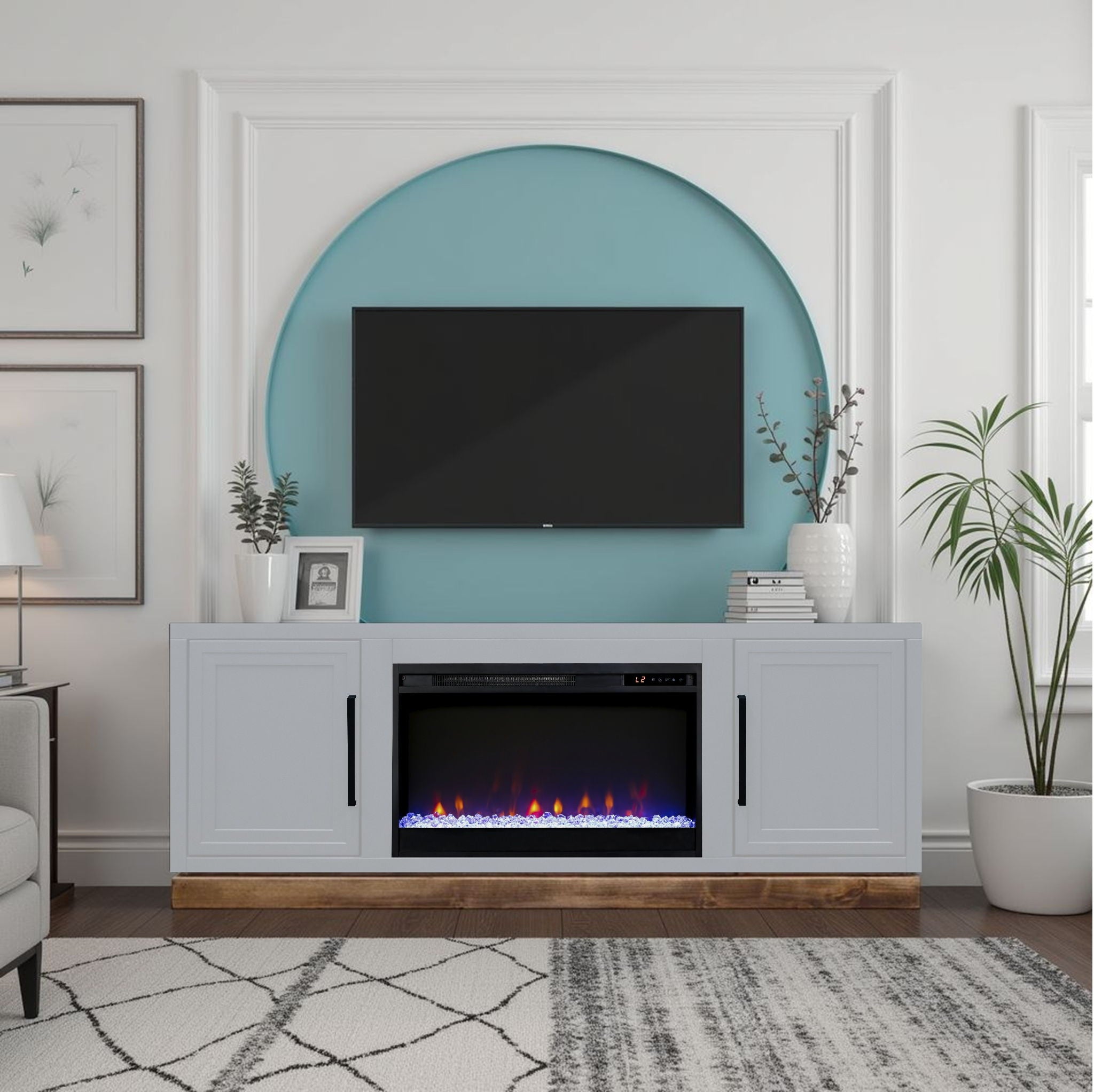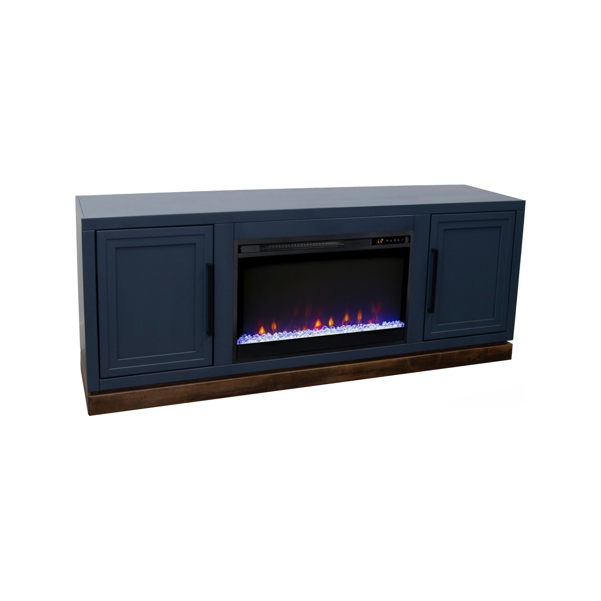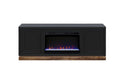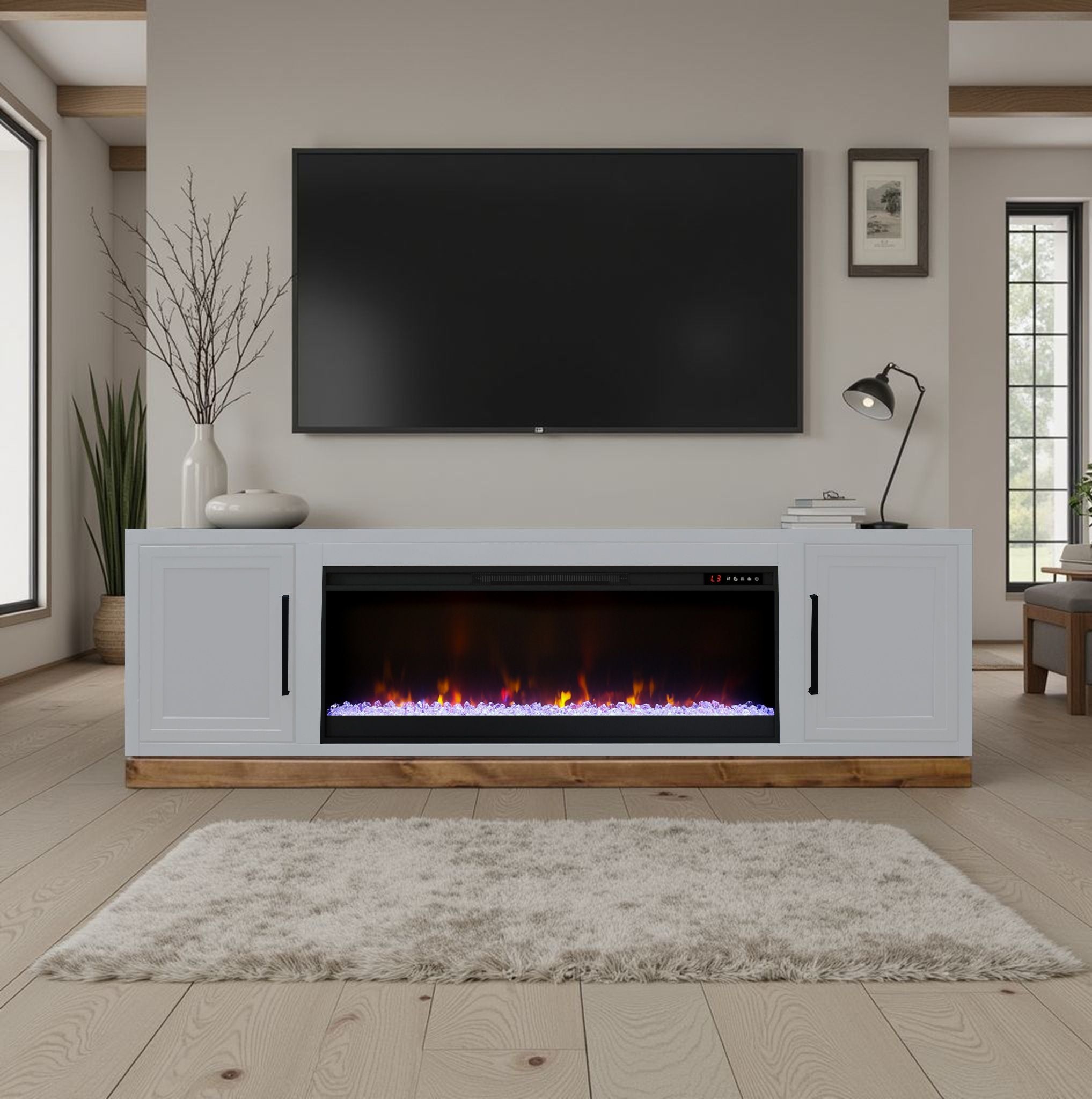 The Nora Fireplace TV Stand boasts clean lines and crisp, refreshing modern styling. Beautifully crafted from Poplar Solids, Knotty Alder Solids and Okume Veneers, this Entertainment Center with Fireplace features a Two-Tone Finish and Black Hardware. Two framed panel doors provide concealed interior shelving for media and gaming consoles. Cable management openings on the back panel will keep all cords and wires organized and out of sight.