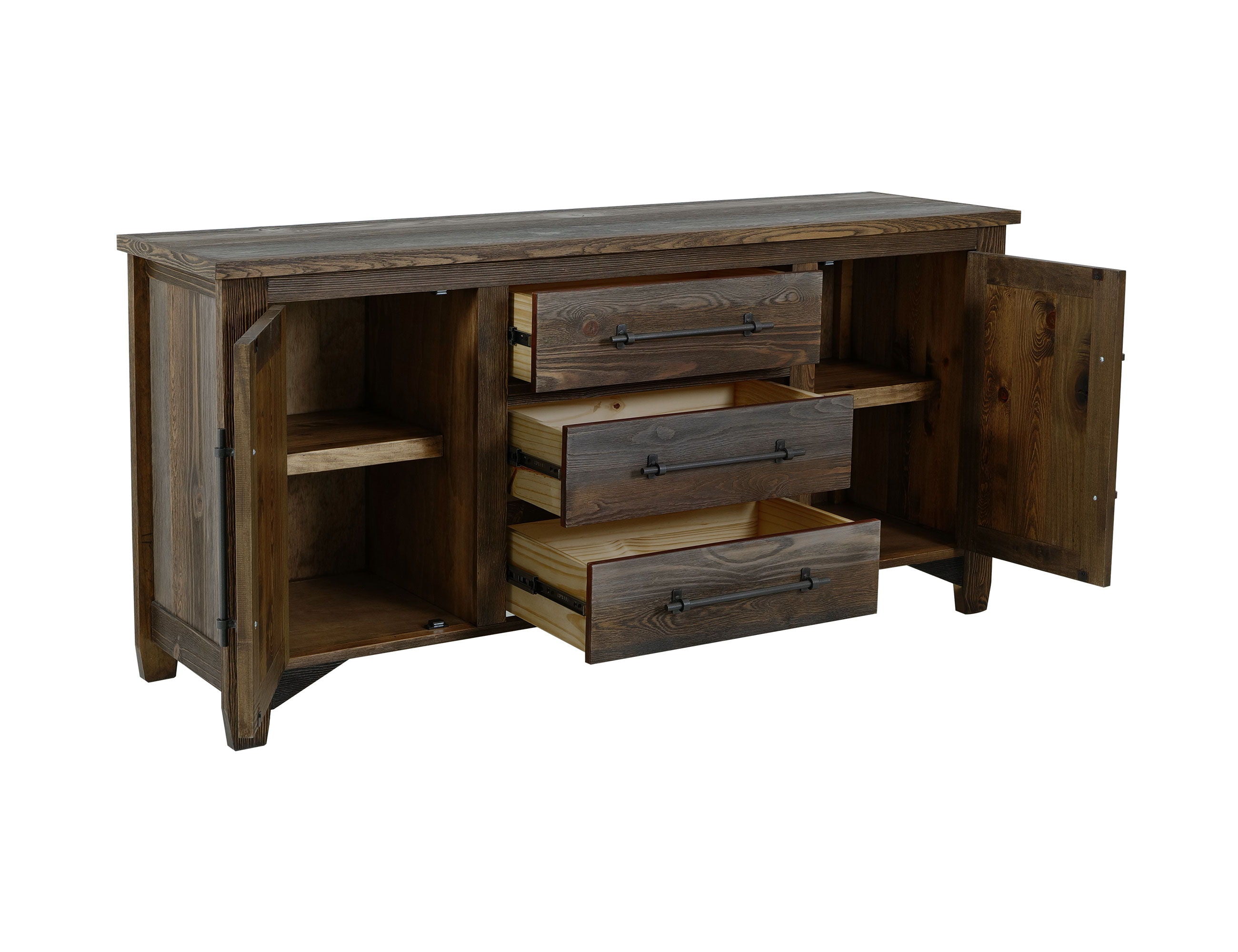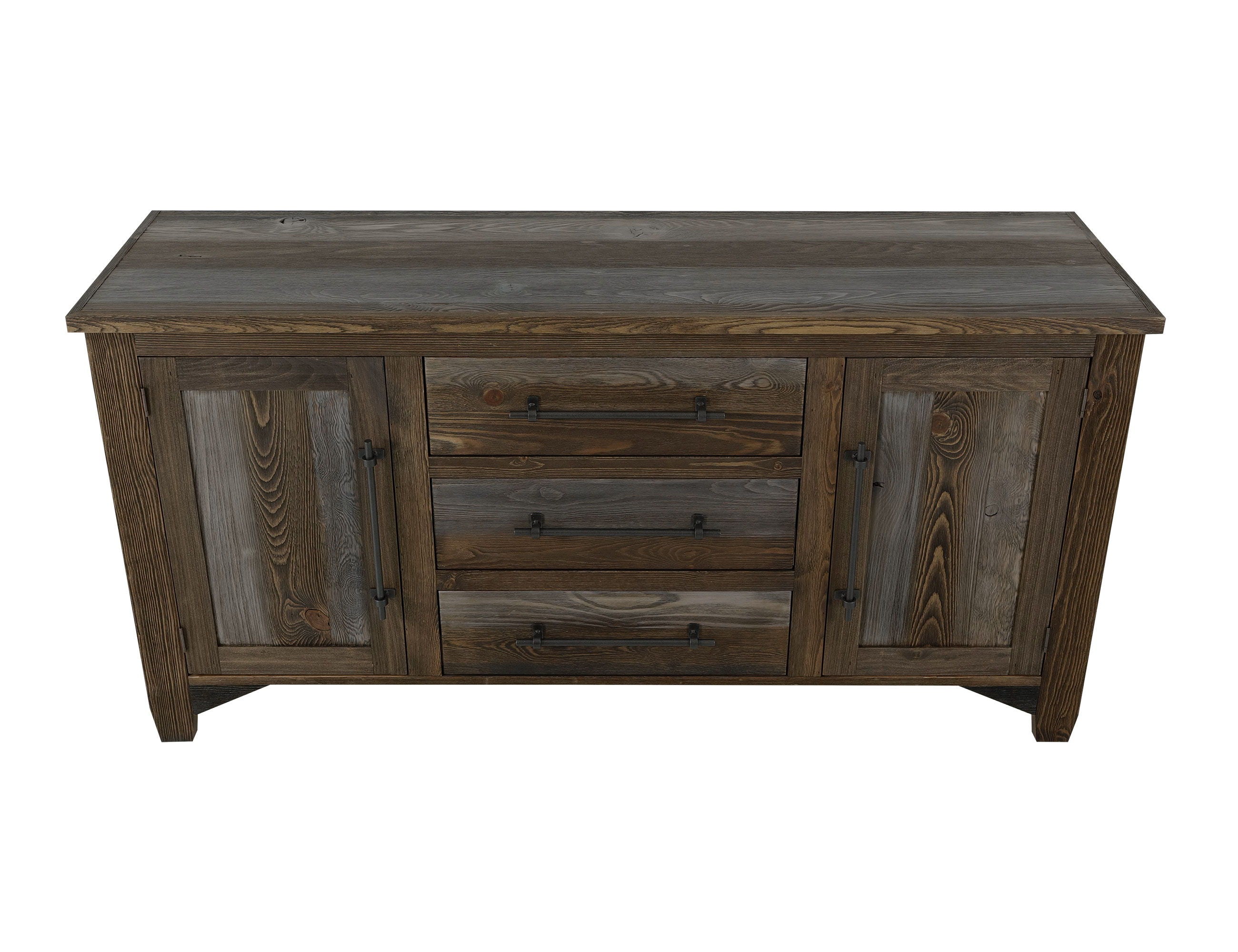 3 Drawer, 2 Door, Buffet. Enhance your dining experience with the Town Dining Collection, which beautifully combines timeless elegance and everyday functionality, exemplified by our thoughtfully designed Town Buffet. This piece showcases a blend of rustic charm and modern sophistication. It features industrial-style iron center handle pulls that create a striking contrast between rugged appeal and refined elegance. The buffet offers practical storage solutions, including shelves hidden behind doors and spacious drawers, making it a statement piece that radiates warmth and character.