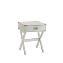 Bring the trending campaign style into your home with this updated Babs end table. With featuring of metal corner strapping and flush mount drawer pull which is true to the style. It is also offered in three colors to expand the options of this timeless design red, black, and white.