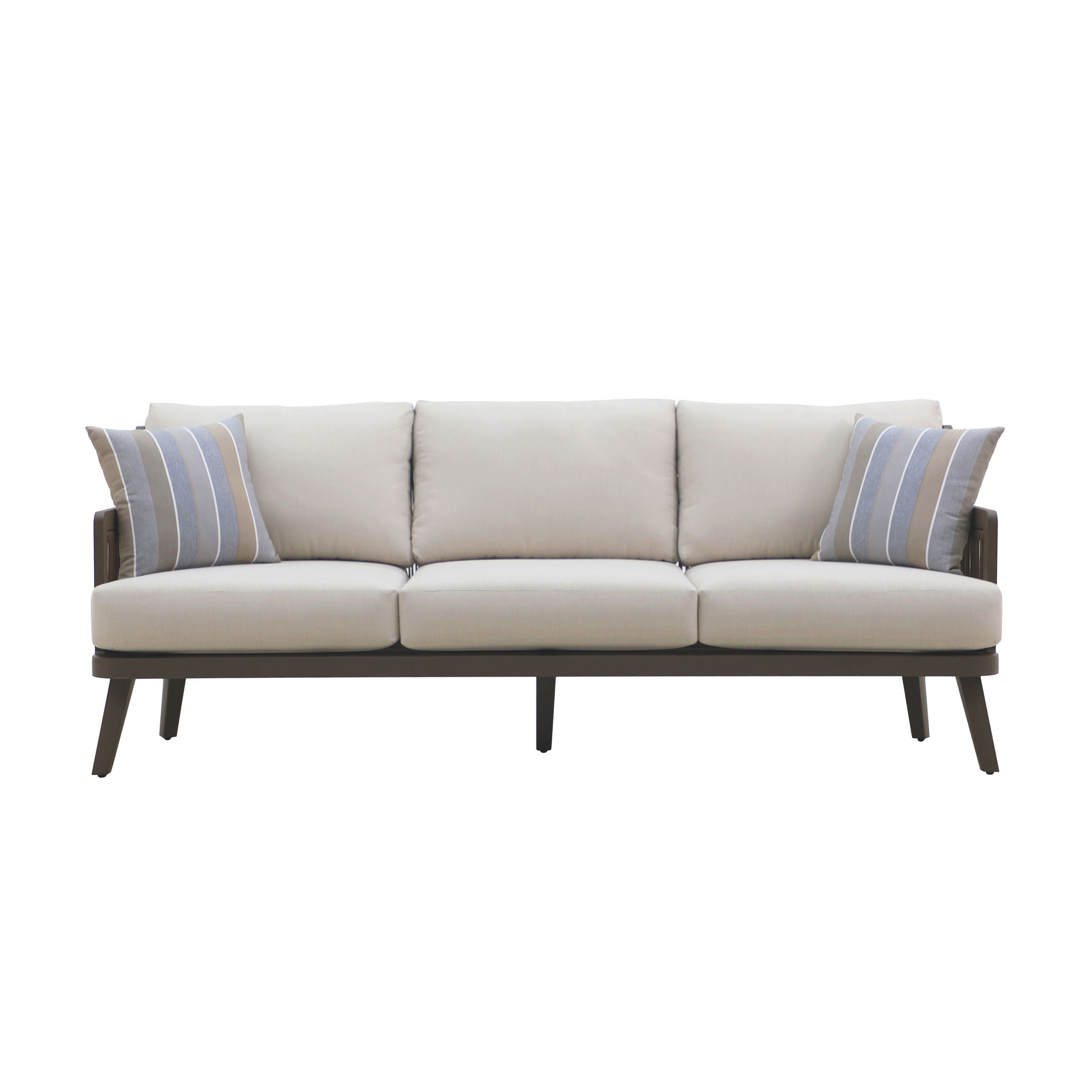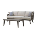 The Genova Patio Set, featuring a spacious patio sofa and a stylish coffee table, effortlessly combines durability, comfort, and modern sophistication for any outdoor space. Built with durable aluminum frames and a baked-on powder coat finish, this set offers superior scratch resistance and long-lasting performance. Designed for all-weather durability, the furniture is wrapped in high-density PE wicker, an eco-friendly synthetic resin that provides the classic look of wicker with the added benefits of being low-maintenance, colorfast, and resistant to water, mildew, and fading. The sofa features plush 6 ½" high-density foam seat and back cushions upholstered in premium light gray Sundura™ fabric—a solution-dyed 100% polyester that resists fading, mildew, and moisture, ensuring vibrant color and lasting protection season after season. The coffee table’s slatted top adds a classic touch while promoting water drainage for added practicality. Designed with clean lines, neutral tones, and a woven rope seat back, this set delivers an open, airy feel with solid structural support. The minimalist design is enhanced by evenly spaced vertical strands, bringing a refined texture and contemporary elegance to any outdoor setting.