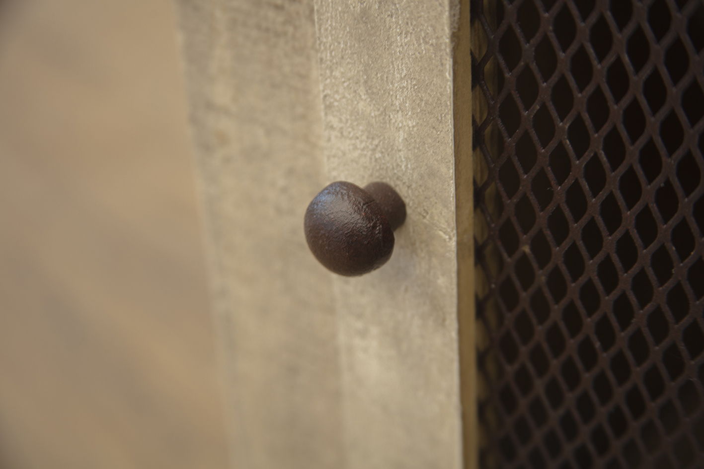 - Sliding barn-style door with Iron mesh on door panel offer convenience and rustic appeal.