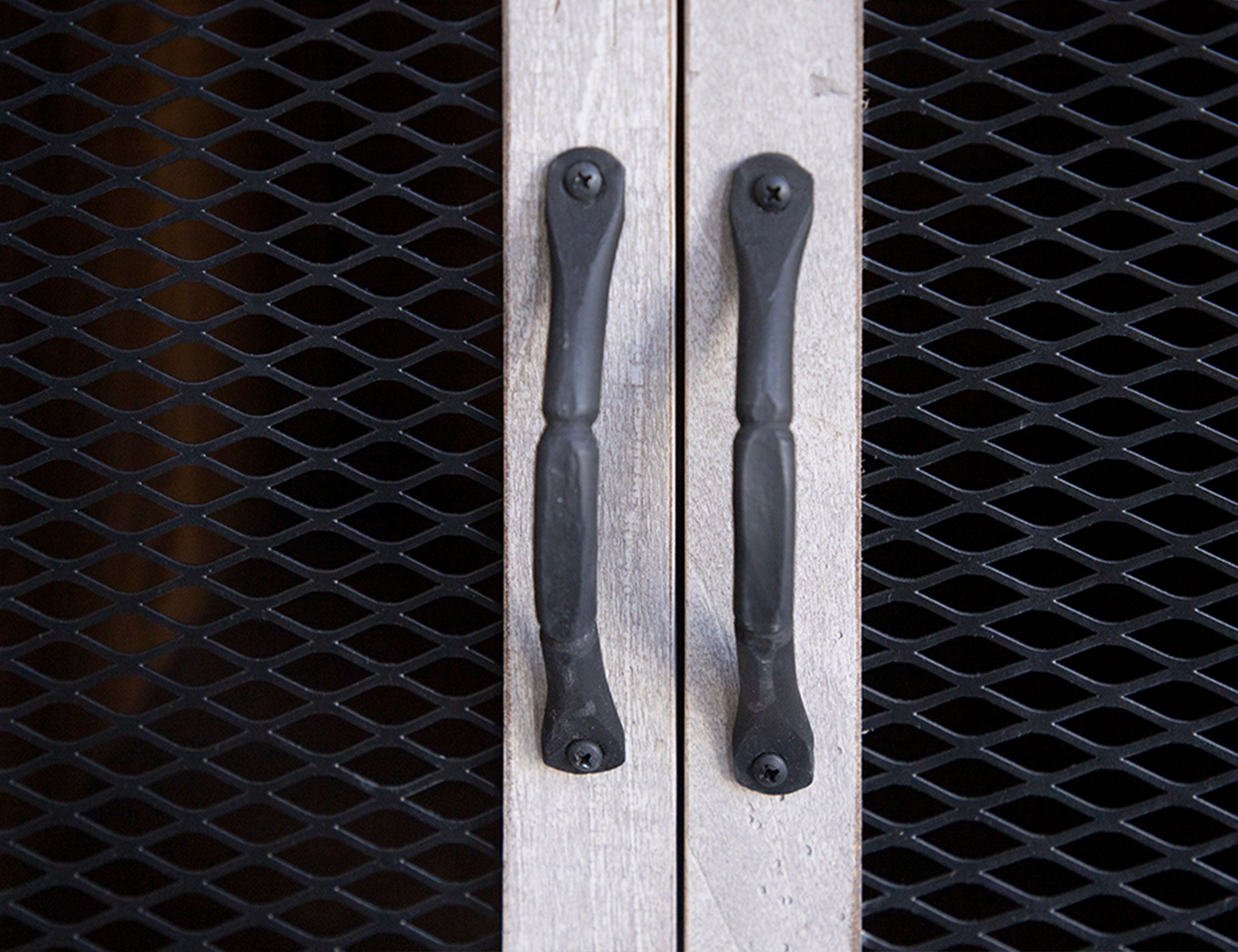 1 Metal Mesh Door Chairside Table. Introducing our Pueblo collection, crafted from solid pine wood. This rustic collection is the perfect addition to bring your dream space to life. It features a hand-distressed finish in black and brown on the tops.