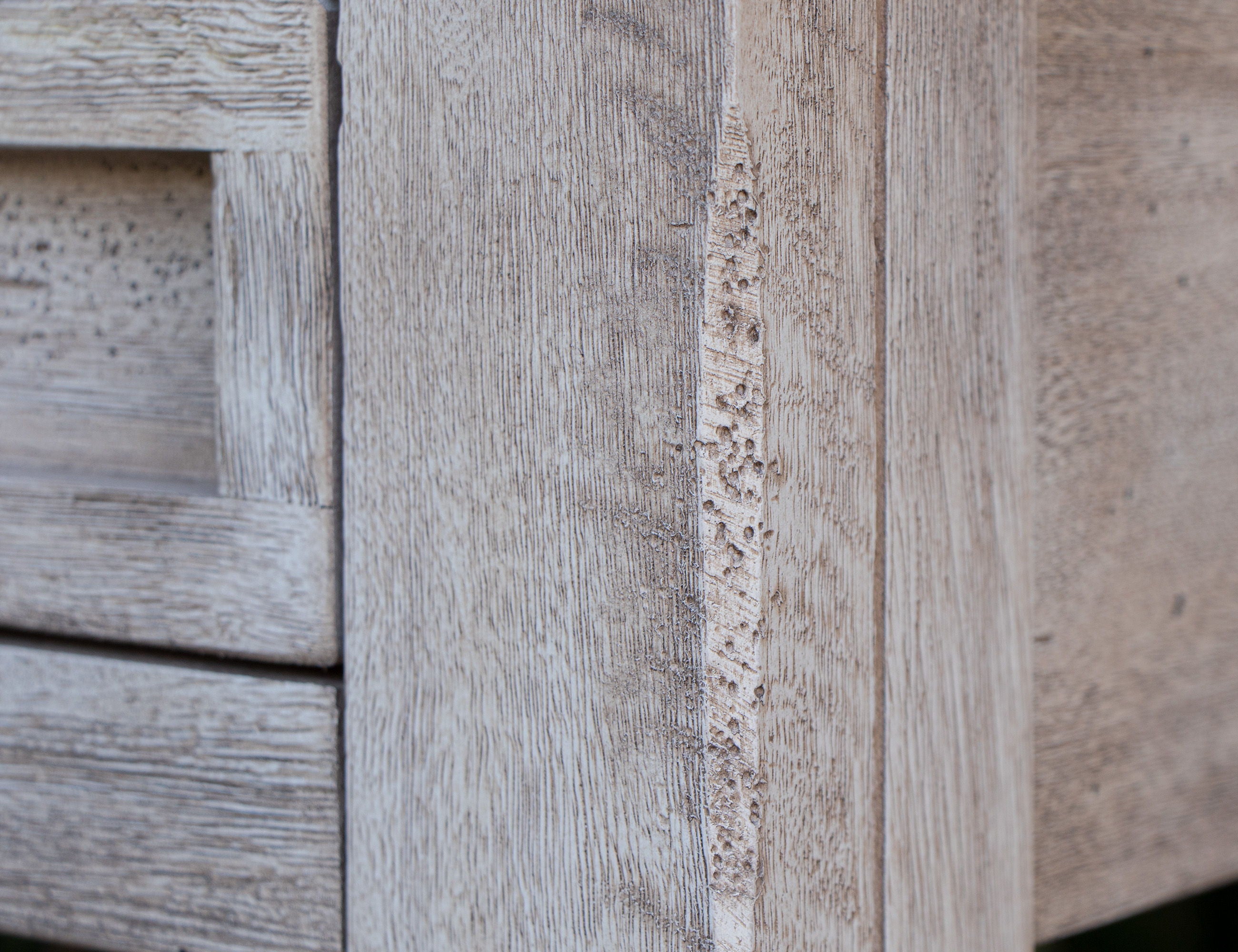 - Multi-step lacquer finish in a cream tone on the case and caramel brown on the tops. Additionally, the wood is wire-brushed and features a wormhole effect.
