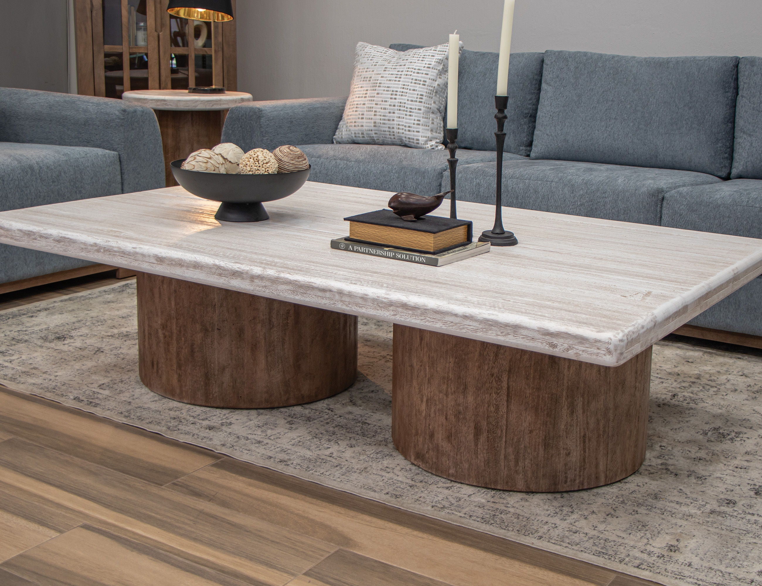 Cocktail Table. Introducing Sahara, an organic modern collection designed to transform your space into a tranquil and neutral haven. Crafted from sustainably sourced, lightly distressed mango wood, this stunning minimalistic collection effortlessly blends style and sustainability, making it a perfect fit for any space.