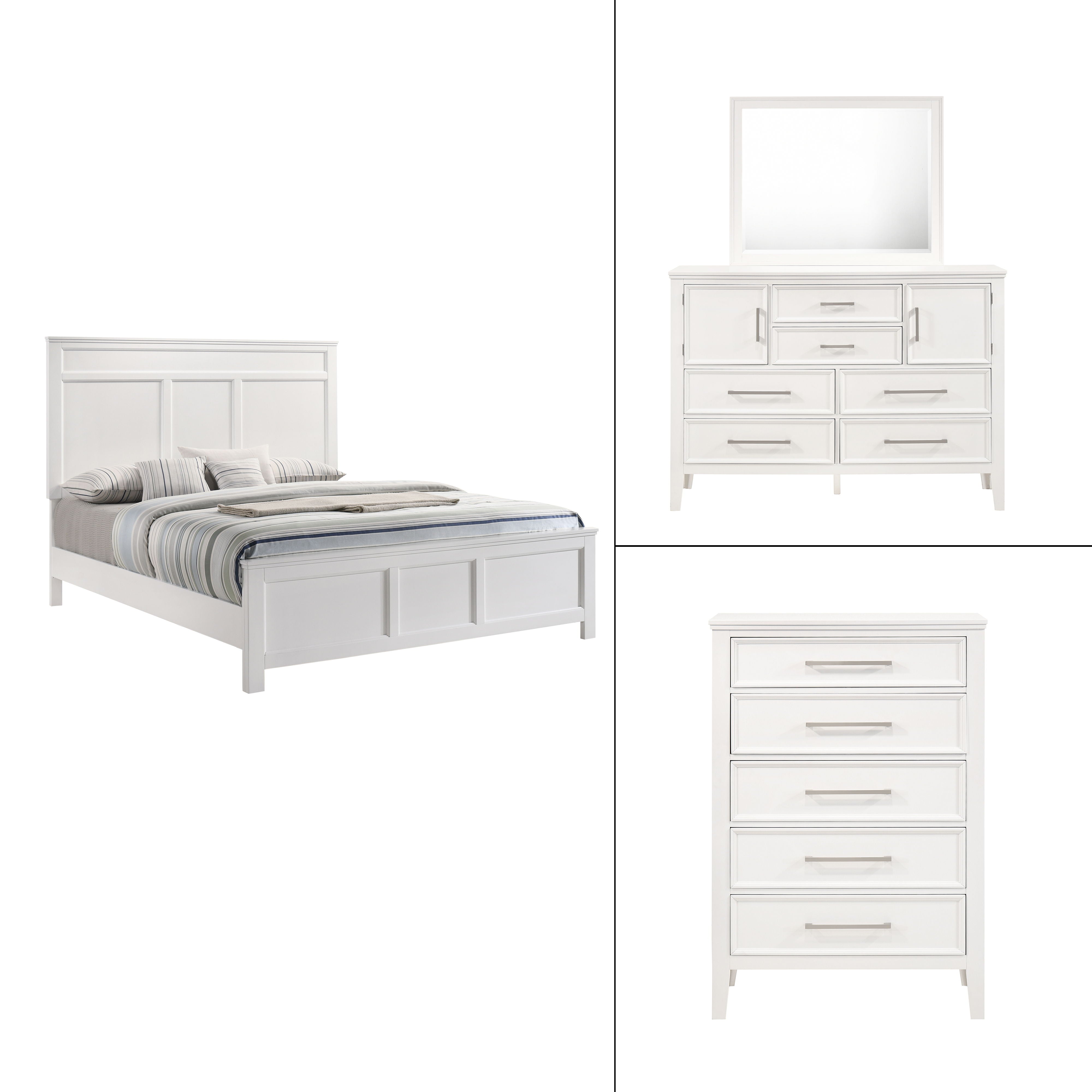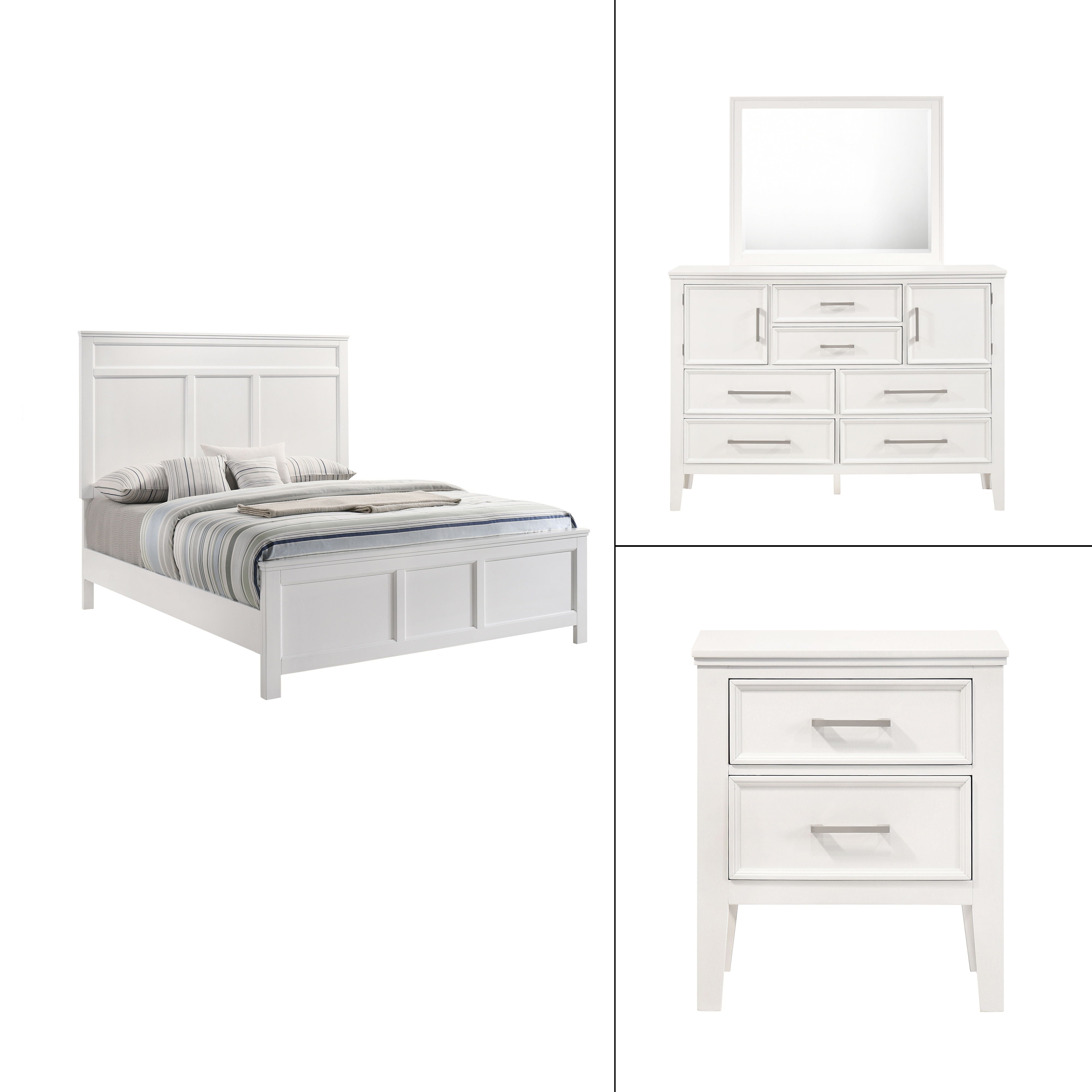 The Andover Wood Bedroom Set in offers a complete and elegant solution for your bedroom, combining durability, style, and functionality. This set all expertly crafted from solid Rubberwood, manufactured woods, and wood veneers, ensuring lasting durability while highlighting the natural beauty of real wood. The semi-gloss finish provides a crisp, versatile appeal that effortlessly complements a wide range of décor styles, whether modern or traditional, enhancing your space with a fresh and refined look. The Andover collection''s clean lines and understated contemporary design create a seamless and cohesive aesthetic. Sleek, elongated metallic handles add a touch of sophistication, standing out gracefully against the pristine finish, while framed drawer fronts offer visual depth and dimension. The sturdy block-style legs provide a solid foundation, reinforcing the collection''s robust and enduring construction. The drawers glide smoothly on robust Kenlin drawer glides, and the dovetail joinery inside reflects superior craftsmanship and enduring quality. This set combines timeless design with practical functionality, making it a stylish and reliable choice for any bedroom.