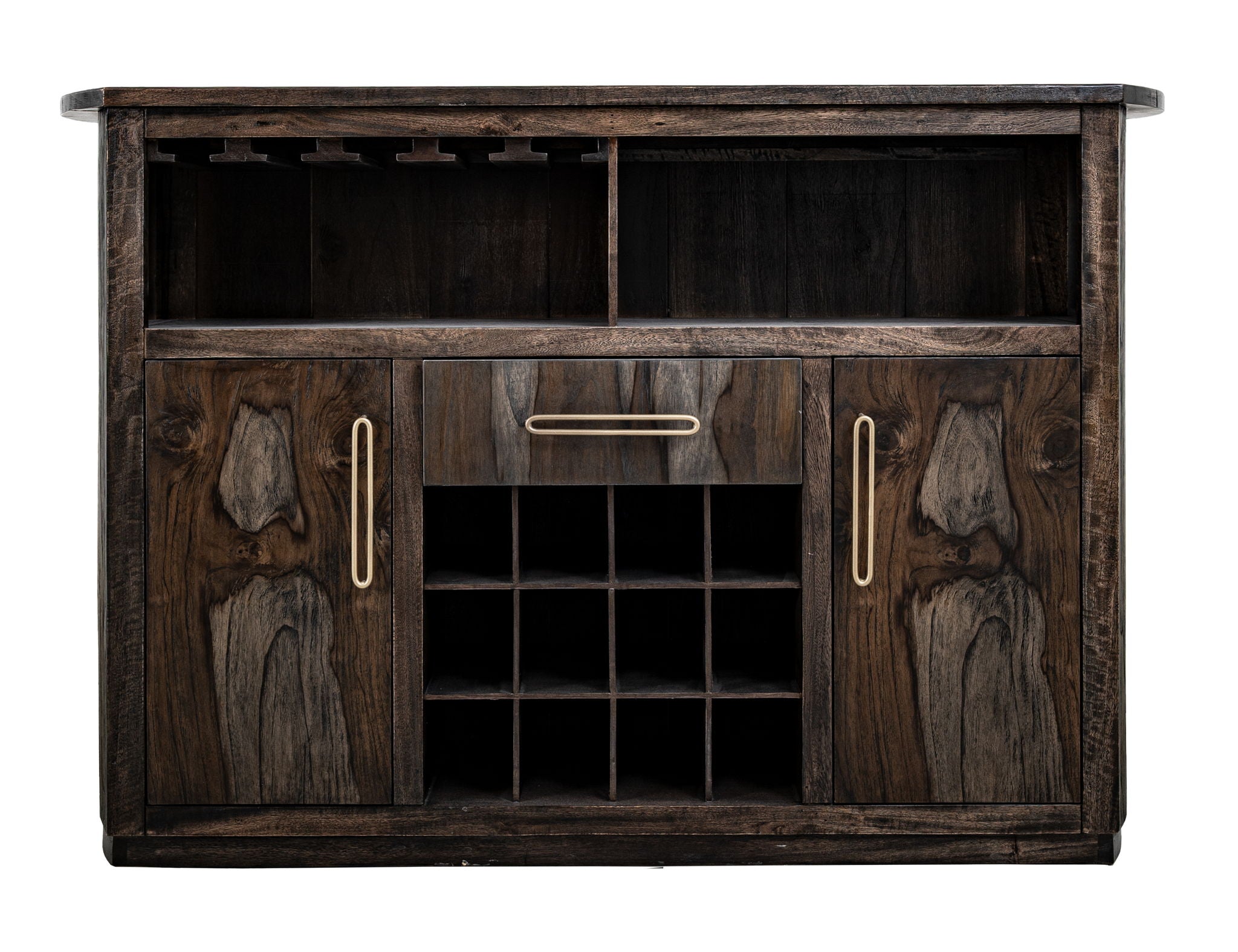 1-Drawer, 2-Door Bar with Wine Grid. Transform your space with our Balam mango and teak wood bar, crafted to blend wood's warmth and beauty with timeless elegance. Its rich wood grain and meticulous finishing make it a captivating focal point. Ideal for hosting gatherings or creating a stylish cocktail corner, our bar offers both functionality and style. Featuring ample storage, a spacious countertop, and a seamless blend of classic and contemporary design, it's the perfect addition to a welcoming, sophisticated gathering spot.