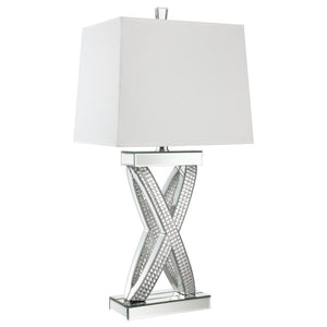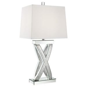 This table lamp features a sculptural X-shaped base accented with shimmering mirrored panels and faceted acrylic crystal inlays. Its bold silhouette and reflective finish create a dramatic presence, while a rectangular white shade provides soft ambient light. Designed to stand out in any glam-inspired space, the lamp fuses artistic form with modern shine—perfect for entryways, bedrooms, or living room consoles seeking a touch of sparkle and geometric sophistication.