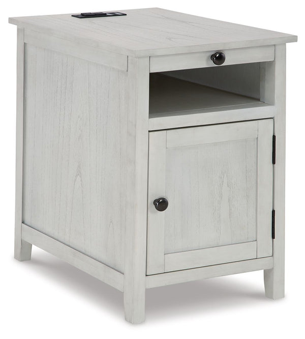 Add big character to a small space with this chairside end table. With its compact size and strong silhouette, it can go anywhere and blend easily into the decor. Less is so much more with the Shaker-inspired design and whitewashed wood grain finish. Loaded with form and function, this end table displays accent pieces and stores essentials securely while keeping devices powered up.