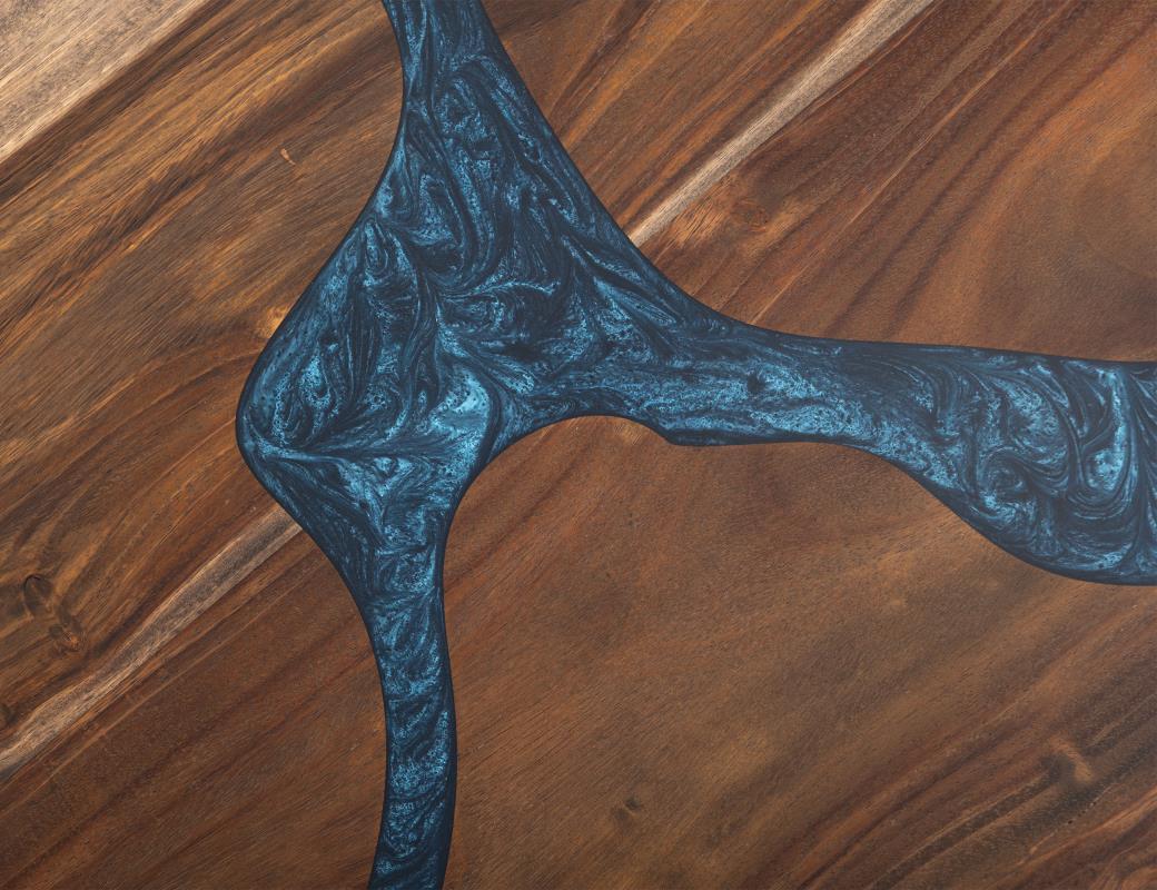 Bring refined artistry into your home with the Zaphiro River Table, a stunning blend of natural elegance and bold design. Handcrafted from parota and sustainable mango wood. Flowing through the center is a gemstone-inspired river inlay, created with epoxy resin infused with shimmering blue flakes that capture the depth and brilliance of sapphire. This luminous detail adds movement and visual intrigue, transforming the tabletop into a true work of functional art. The rich grain and tonal variation of parota wood are thoughtfully highlighted, offering warmth and texture that complement a range of interiors. The pedestal base, with its geometric design, is crafted from sturdy wood, providing a stable, long-lasting foundation and making it ideal for everyday use. Built with IFD’s commitment to quality, sustainability, and timeless design, the Zaphiro Round Table offers exceptional character, craftsmanship, and functionality for today’s home.